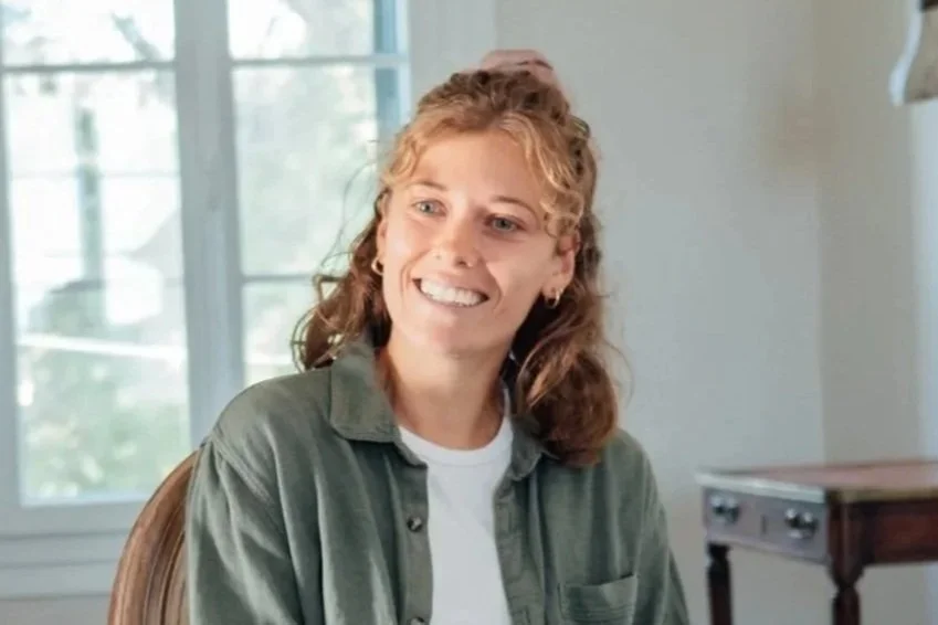 A woman with blonde hair wearing a striped shirt is sitting on a beige chair and smiling during an interview or conversation, with a person in the foreground recording or filming her in a cozy room with wooden walls and furniture.